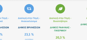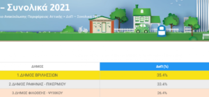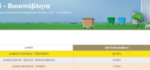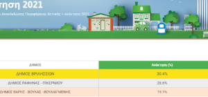 Είναι χαρακτηριστικό ότι όσον αφορά στα βιοαπόβλητα ο Δήμος μας βρίσκεται στην ΠΡΩΤΗ θέση της κατάταξης (πίνακας 2) με 20,30% με τον Δήμο Βάρης – Βούλας – Βουλιαγμένης να ακολουθεί με 14,50%, ενώ και στην Ανάκτηση (πίνακας 3) ο Δήμος μας που βρίσκεται στη δεύτερη θέση με 28,6% υπολείπεται από τον Δήμο Βριλησσίων μόλις 1,8%. Στα ανακυκλώσιμα ο Δήμος μας βρίσκεται επίσης σε ικανοποιητική θέση με 13,1% με σημαντικές προοπτικές ανόδου καθώς ήδη τα αποτελέσματα από τα προγράμματα που εφαρμόζουμε δείχνουν καθημερινή πρόοδο.