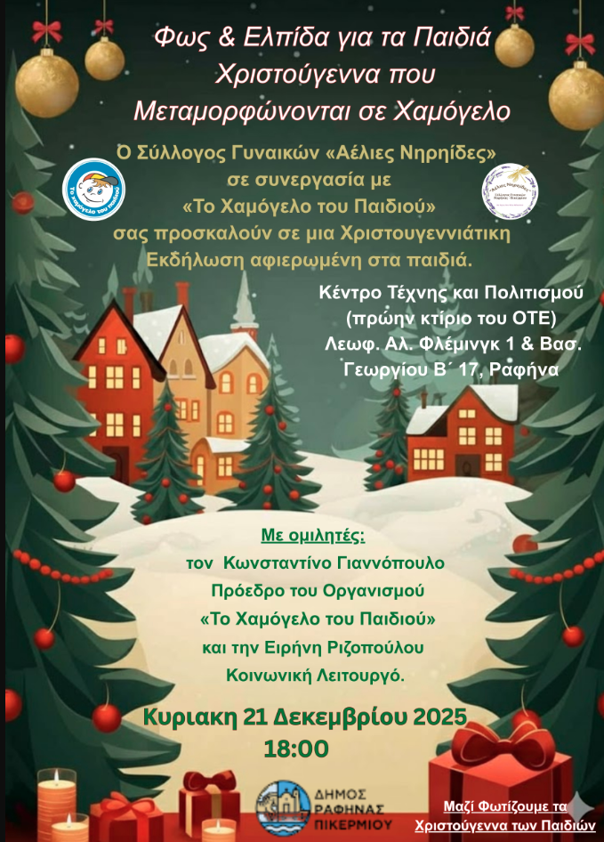 Ο Σύλλογος Γυναικών «Αέλιες Νηρηίδες», σε συνεργασία με τον Οργανισμό «Το Χαμόγελο του Παιδιού», σας προσκαλούν σε μια ξεχωριστή Χριστουγεννιάτικη εκδήλωση αφιερωμένη στα παιδιά.