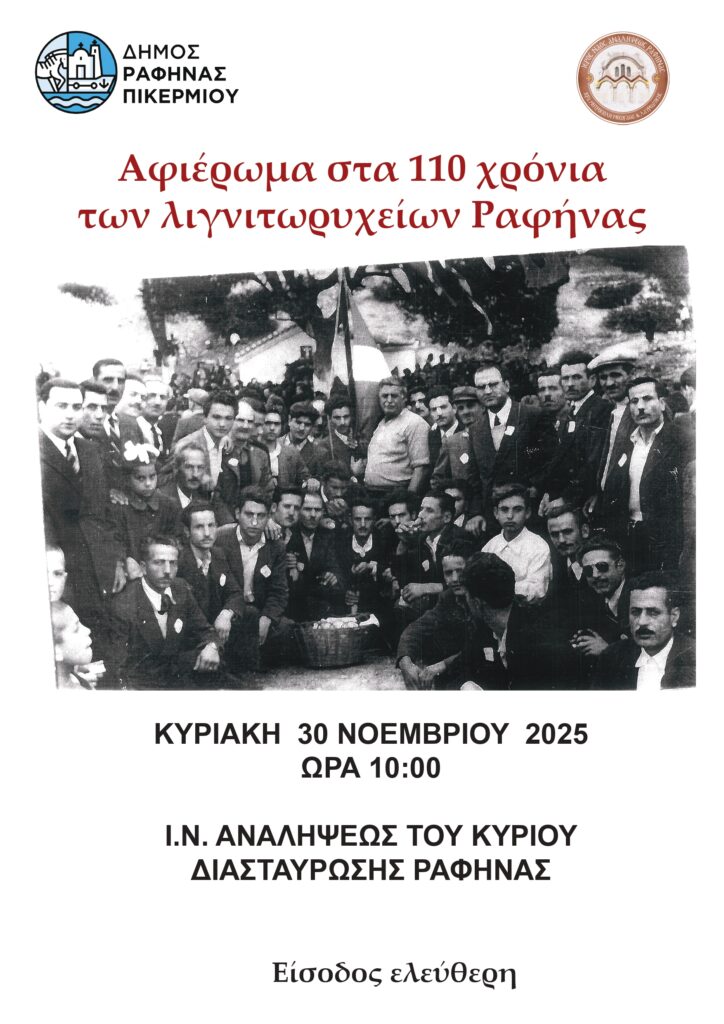 Ο Δήμος Ραφήνας-Πικερμίου και ο Ιερός Ναός Αναλήψεως του Κυρίου Διασταύρωσης Ραφήνας, τιμούν τους λιγνιτωρύχους, πρώτους οικιστές της Διασταύρωσης, με ένα αφιέρωμα στην επέτειο των 110 χρόνων από την εγκατάστασή τους στην περιοχή, την Κυριακή 30 Νοεμβρίου 2025 και ώρα 10.00.