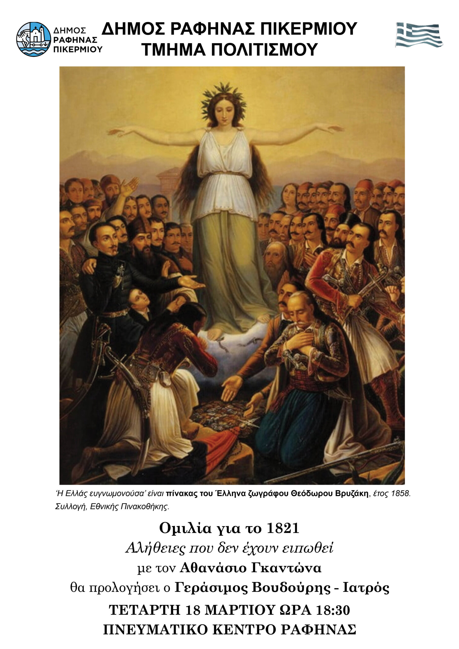 δημοσιολόγο ,βαθύ γνώστη της Ελληνικής Ιστορίας, οργανώνουν την Τετάρτη 18 Μαρτίου 2026 στις 18:30 στο Πνευματικό Κέντρο Ραφήνας ομιλία για την επανάσταση του 1821.