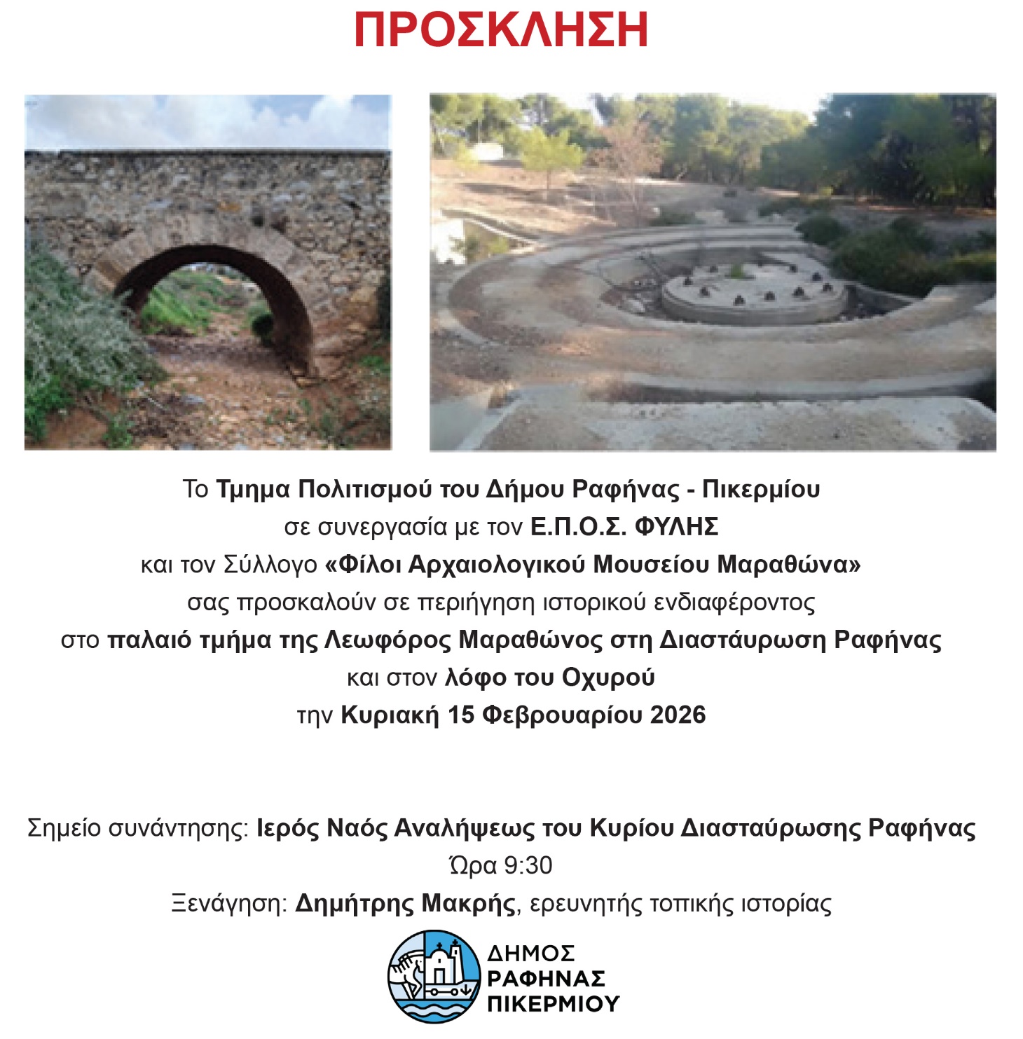 Tο Τμήμα Πολιτισμού του Δήμου Ραφήνας – Πικερμίου σε συνεργασία με τον Ε.Π.Ο.Σ. Φυλής και τον Σύλλογο «Φίλοι Αρχαιολογικού Μουσείου Μαραθώνα» σας προσκαλούν σε περιήγηση ιστορικού ενδιαφέροντος στο παλαιό τμήμα της Λεωφόρου Μαραθώνος στη Διασταύρωση Ραφήνας και στον λόφο του Οχυρού την Κυριακή 15 Φεβρουαρίου 2026.